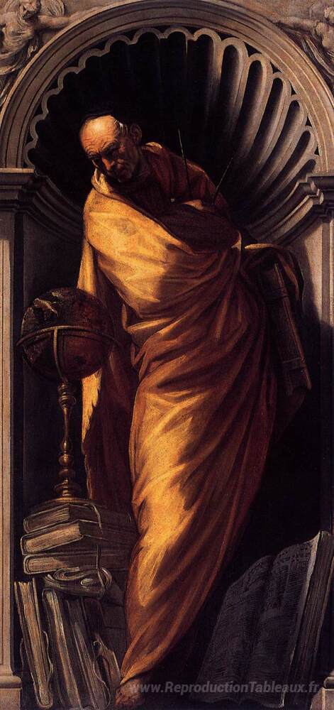 Nous vous proposons une reproduction artisanale sur toile du célèbre tableau 'Un philosophe' de Tintoretto, provenant du Musée de la Reproduction.