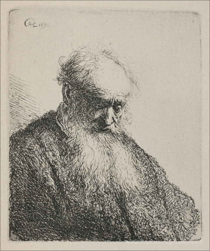 Nous vous proposons une reproduction artisanale sur toile du célèbre tableau 'Un vieil homme avec une barbe' de Rembrandt, provenant du Musée de la Reproduction.