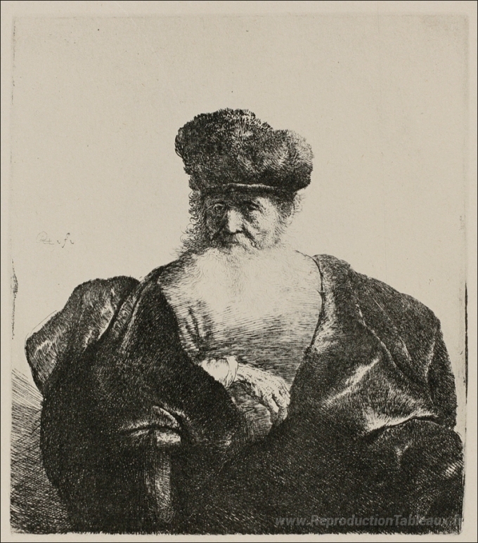 Nous vous proposons une reproduction artisanale sur toile du célèbre tableau 'Un vieil homme avec une barbe, une casquette de fourrure et un m' de Rembrandt, provenant du Musée de la Reproduction.