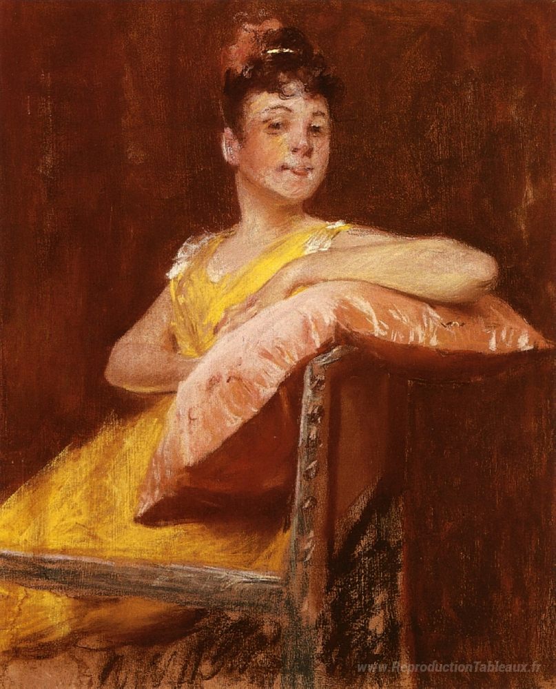 Nous vous proposons une reproduction artisanale sur toile du célèbre tableau 'Une fille en jaune (alias la robe jaune)' de William Merritt Chase, provenant du Musée de la Reproduction.