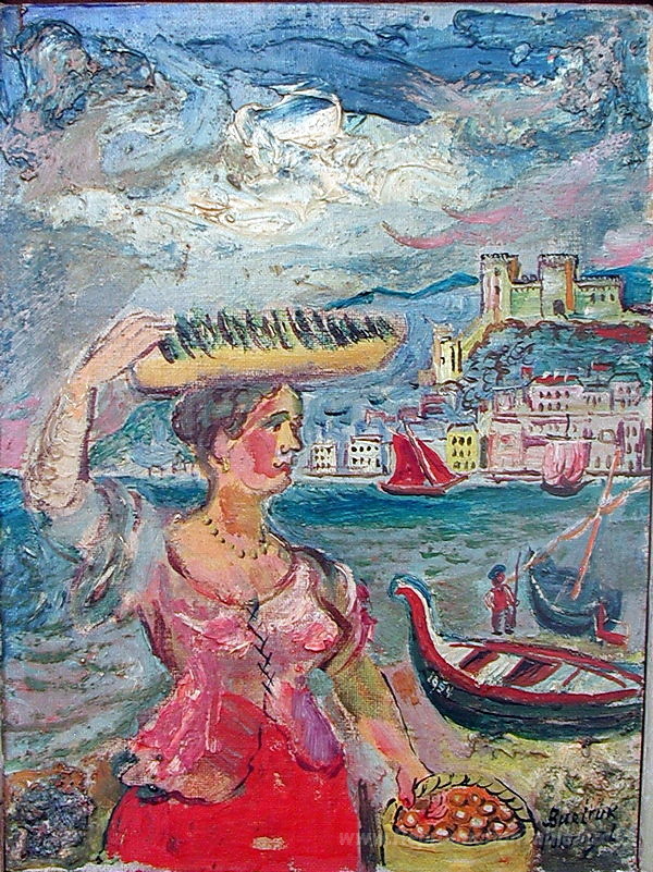 Nous vous proposons une reproduction artisanale sur toile du célèbre tableau 'Une fille' de David Burliuk, provenant du Musée de la Reproduction.