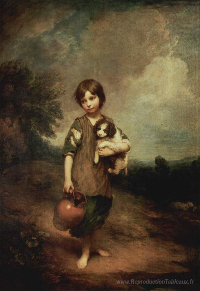 Nous vous proposons une reproduction artisanale sur toile du célèbre tableau 'Une paysanne avec un chien et une cruche' de Thomas Gainsborough, provenant du Musée de la Reproduction.