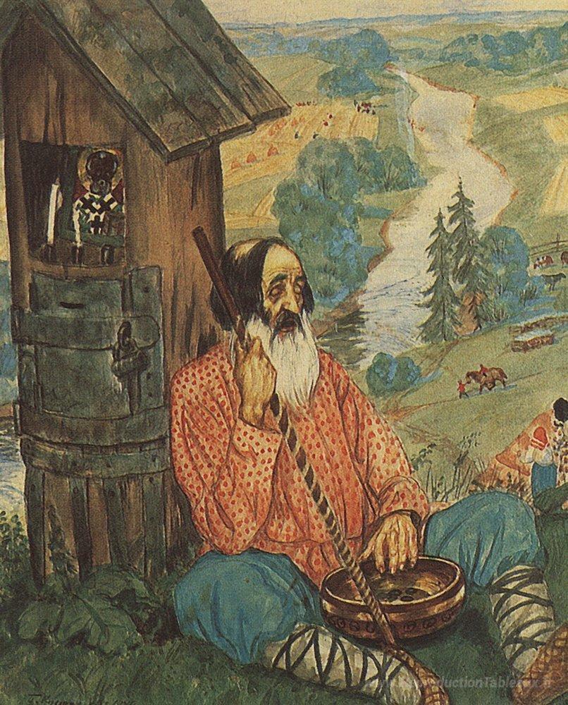 Nous vous proposons une reproduction artisanale sur toile du célèbre tableau 'Vagabond' de Boris Kustodiev, provenant du Musée de la Reproduction.