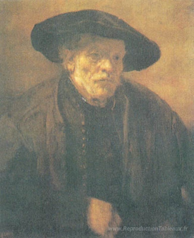 Nous vous proposons une reproduction artisanale sur toile du célèbre tableau 'Vieil homme avec un béret' de Rembrandt, provenant du Musée de la Reproduction.