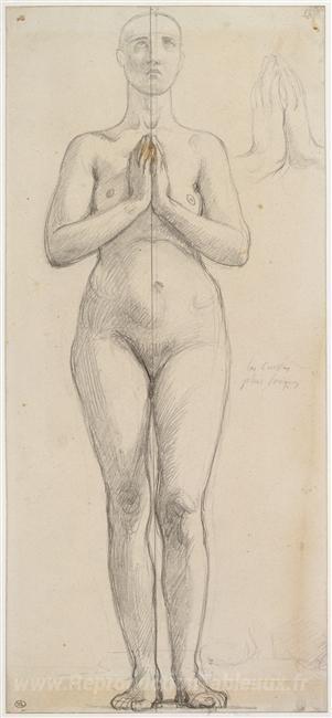 Nous vous proposons une reproduction artisanale sur toile du célèbre tableau 'Étude de la sainte Isabelle nue de France' de Jean Auguste Dominique Ingres, provenant du Musée de la Reproduction.