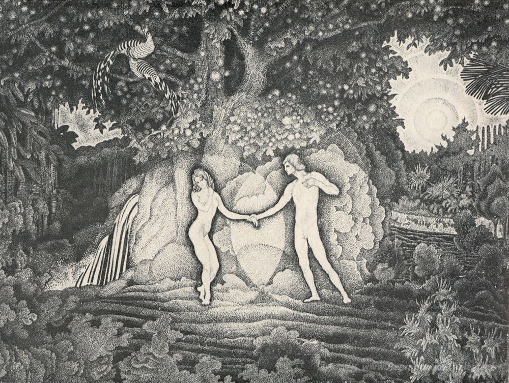 Nous vous proposons une reproduction artisanale sur toile du célèbre tableau 'Adam et Eve' de Konstantin Yuon, provenant du Musée de la Reproduction.