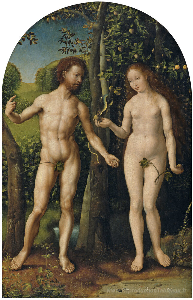 Nous vous proposons une reproduction artisanale sur toile du célèbre tableau 'Adam et Eve' de Mabuse, provenant du Musée de la Reproduction.