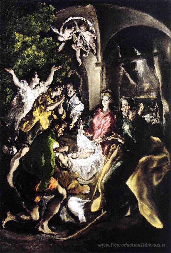 Nous vous proposons une reproduction artisanale sur toile du célèbre tableau 'Adoration des bergers' de El Greco, provenant du Musée de la Reproduction.