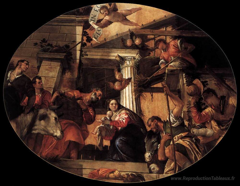 Nous vous proposons une reproduction artisanale sur toile du célèbre tableau 'Adoration des bergers' de Paolo Veronese, provenant du Musée de la Reproduction.