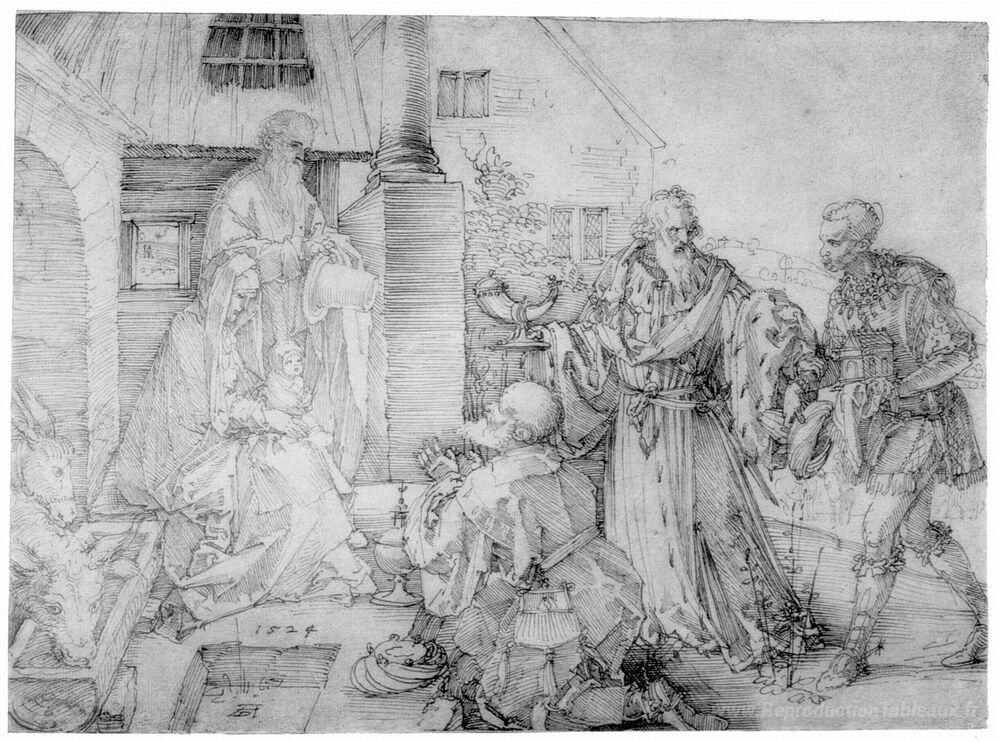 Nous vous proposons une reproduction artisanale sur toile du célèbre tableau 'Adoration des mages' de Albrecht Durer, provenant du Musée de la Reproduction.