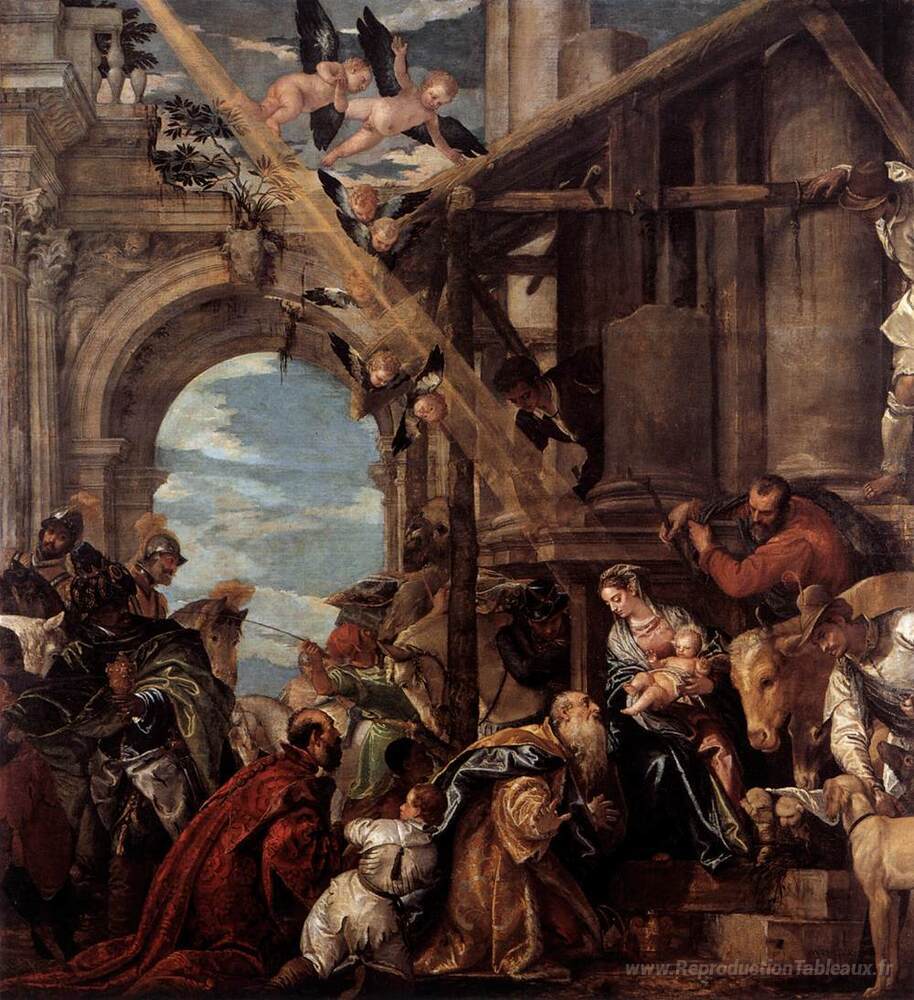 Nous vous proposons une reproduction artisanale sur toile du célèbre tableau 'Adoration des mages' de Paolo Veronese, provenant du Musée de la Reproduction.