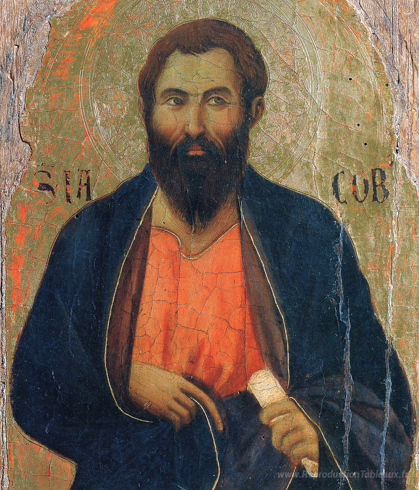 Nous vous proposons une reproduction artisanale sur toile du célèbre tableau 'Apôtre Jacob' de Duccio, provenant du Musée de la Reproduction.