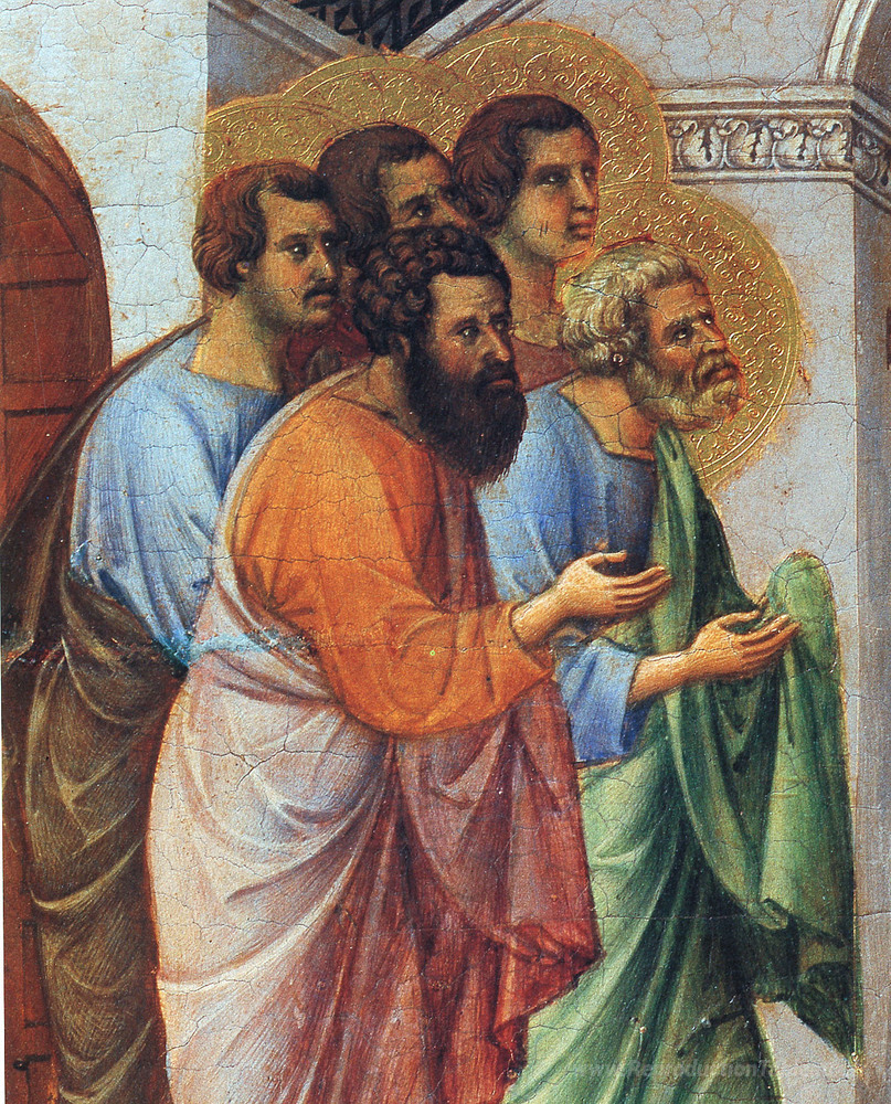 Nous vous proposons une reproduction artisanale sur toile du célèbre tableau 'Apparence du Christ aux apôtres (fragment)' de Duccio, provenant du Musée de la Reproduction.