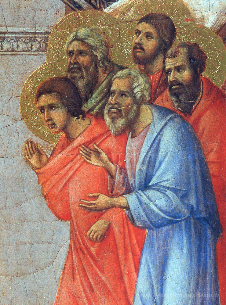 Nous vous proposons une reproduction artisanale sur toile du célèbre tableau 'Apparence du Christ aux apôtres (fragment)' de Duccio, provenant du Musée de la Reproduction.