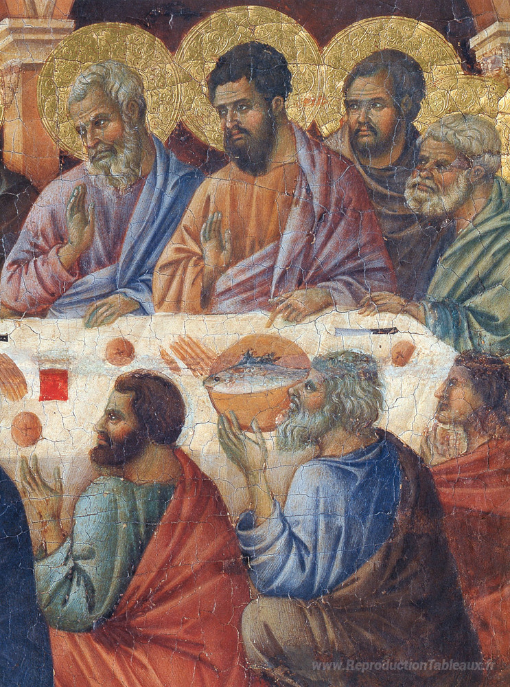 Nous vous proposons une reproduction artisanale sur toile du célèbre tableau 'Apparence du Christ aux apôtres (fragment)' de Duccio, provenant du Musée de la Reproduction.