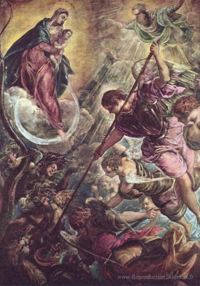 Nous vous proposons une reproduction artisanale sur toile du célèbre tableau 'Bataille de l'Archange Michael et du Satan' de Tintoretto, provenant du Musée de la Reproduction.