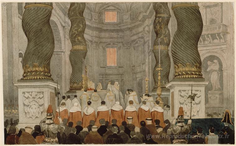 Nous vous proposons une reproduction artisanale sur toile du célèbre tableau 'Cérémonie papale à Saint-Pierre à Rome sous la canopée de Bernin' de Jean Auguste Dominique Ingres, provenant du Musée de la Reproduction.