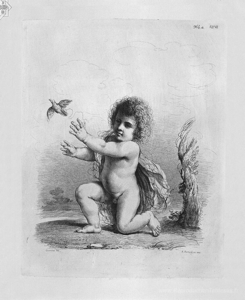 Nous vous proposons une reproduction artisanale sur toile du célèbre tableau 'Chérubin à genoux libérant un oiseau par Guercino' de Giovanni Battista Piranesi, provenant du Musée de la Reproduction.