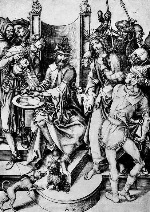 Nous vous proposons une reproduction artisanale sur toile du célèbre tableau 'Christ avant Pilate' de Martin Schongauer, provenant du Musée de la Reproduction.