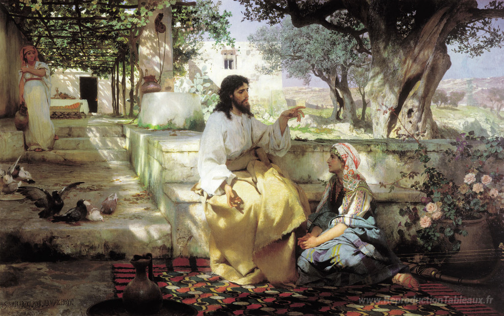 Nous vous proposons une reproduction artisanale sur toile du célèbre tableau 'Christ dans la maison de Martha et Marie' de Henryk Siemiradzki, provenant du Musée de la Reproduction.
