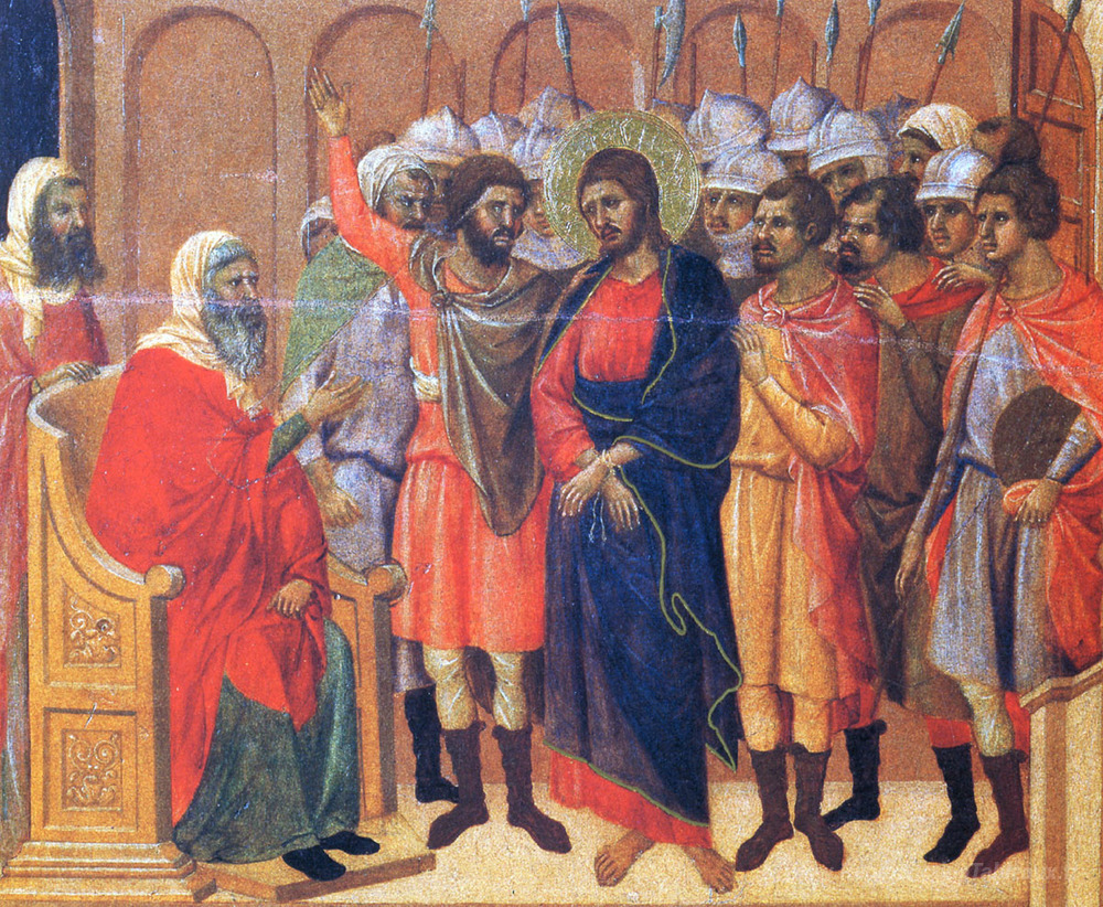 Nous vous proposons une reproduction artisanale sur toile du célèbre tableau 'Christ devant Anna' de Duccio, provenant du Musée de la Reproduction.