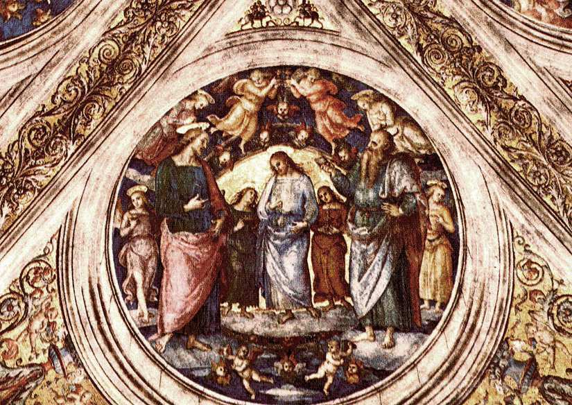 Nous vous proposons une reproduction artisanale sur toile du célèbre tableau 'Christ entre le baptiste et le Satan déguisé en vieil homme' de Pietro Perugino, provenant du Musée de la Reproduction.