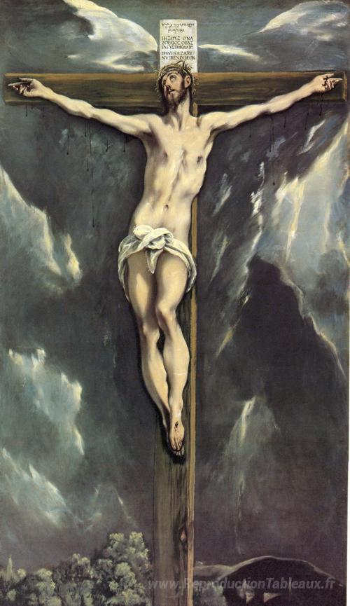 Nous vous proposons une reproduction artisanale sur toile du célèbre tableau 'Christ sur une croix' de El Greco, provenant du Musée de la Reproduction.