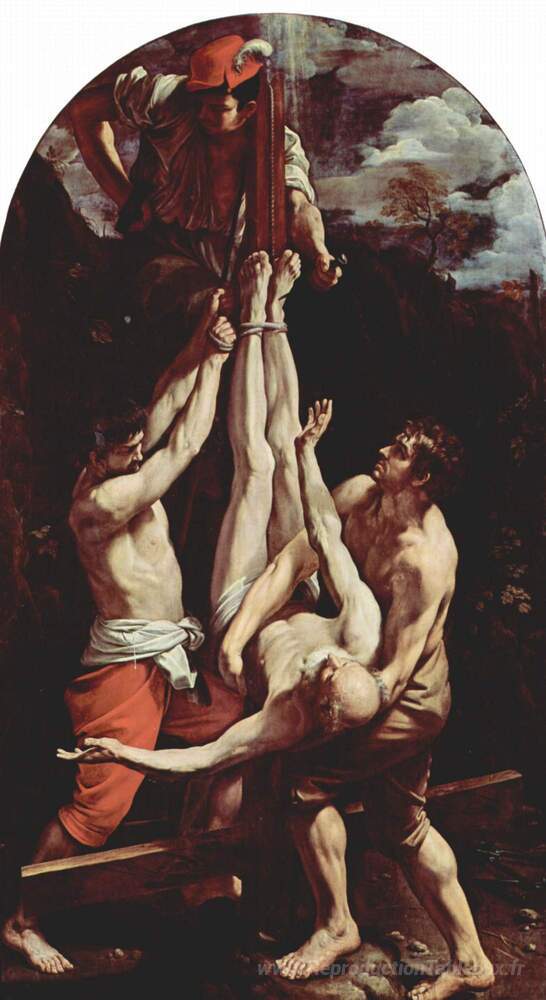 Nous vous proposons une reproduction artisanale sur toile du célèbre tableau 'Crucifixion de Saint-Pierre' de Guido Reni, provenant du Musée de la Reproduction.