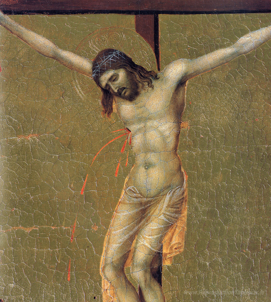 Nous vous proposons une reproduction artisanale sur toile du célèbre tableau 'Crucifixion (fragment)' de Duccio, provenant du Musée de la Reproduction.
