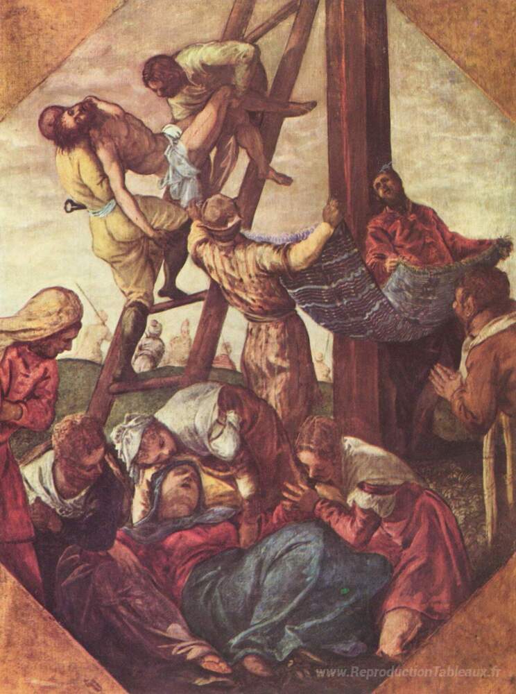 Nous vous proposons une reproduction artisanale sur toile du célèbre tableau 'Déposition' de Tintoretto, provenant du Musée de la Reproduction.