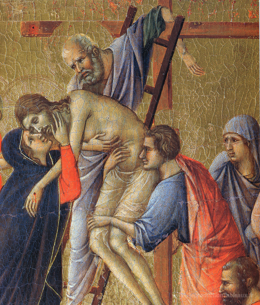 Nous vous proposons une reproduction artisanale sur toile du célèbre tableau 'Descente de la croix (fragment)' de Duccio, provenant du Musée de la Reproduction.