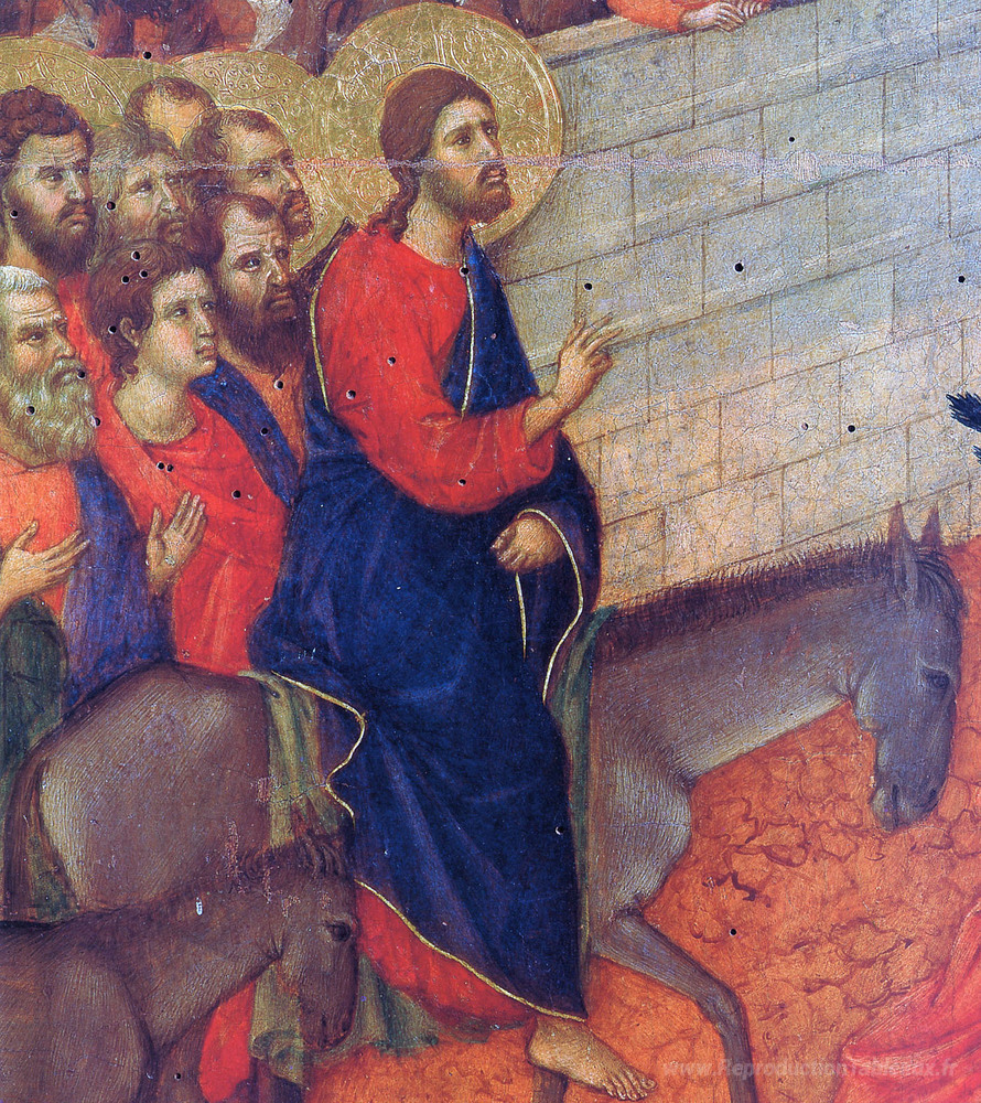 Nous vous proposons une reproduction artisanale sur toile du célèbre tableau 'Entrée à Jérusalem (fragment)' de Duccio, provenant du Musée de la Reproduction.