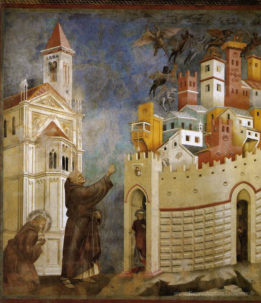 Nous vous proposons une reproduction artisanale sur toile du célèbre tableau 'Exorcisme des démons à Arezzo' de Giotto, provenant du Musée de la Reproduction.
