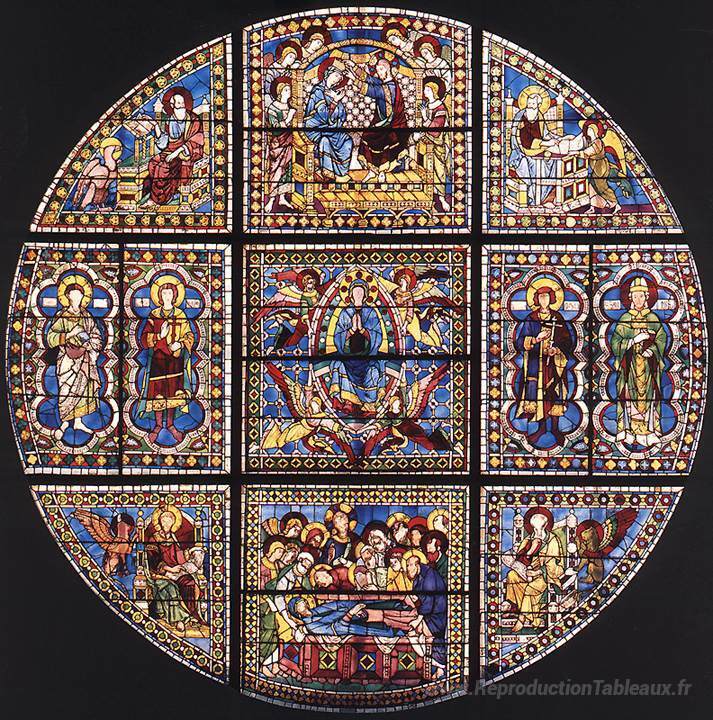 Nous vous proposons une reproduction artisanale sur toile du célèbre tableau 'Fenêtre montrant la mort, l'hypothèse et le couronnement de la V' de Duccio, provenant du Musée de la Reproduction.