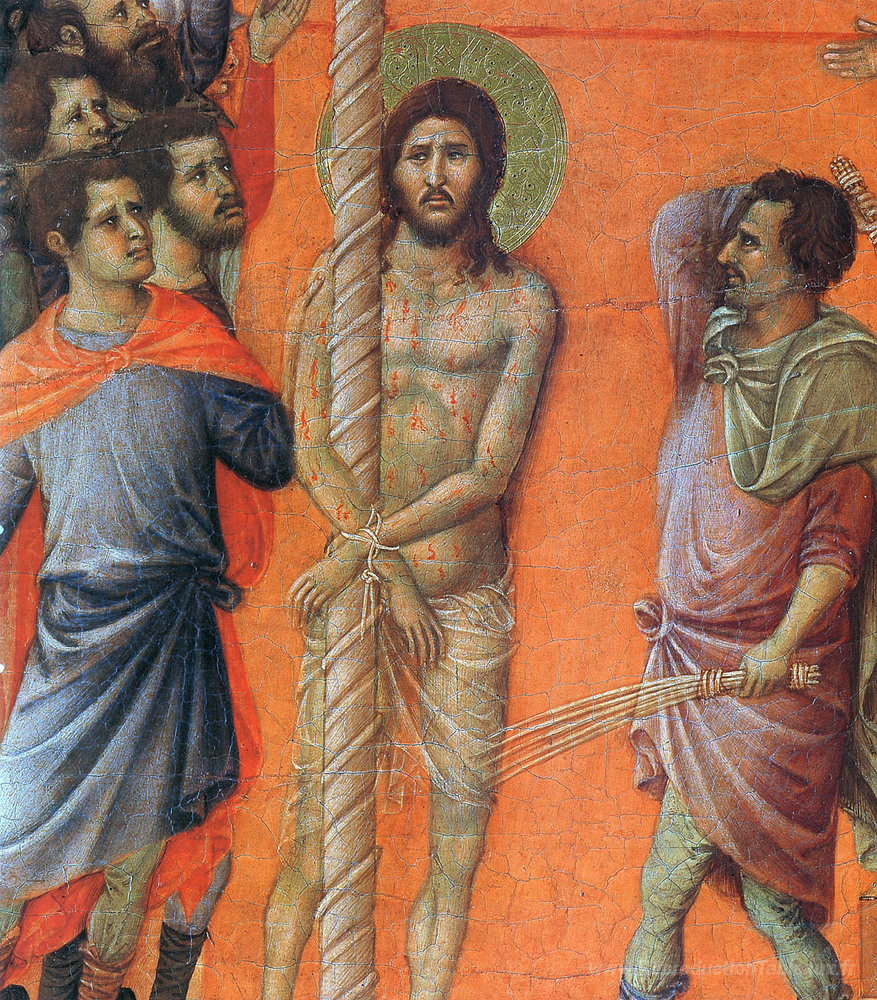 Nous vous proposons une reproduction artisanale sur toile du célèbre tableau 'Flapellation du Christ (fragment)' de Duccio, provenant du Musée de la Reproduction.
