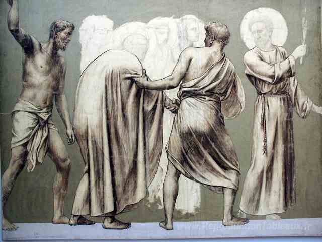 Nous vous proposons une reproduction artisanale sur toile du célèbre tableau 'Fresque pour la décoration du panthéon: saints' de Pierre Puvis de Chavannes, provenant du Musée de la Reproduction.
