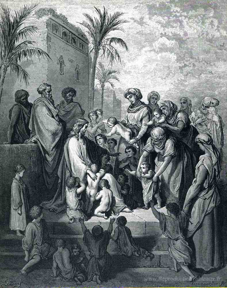 Nous vous proposons une reproduction artisanale sur toile du célèbre tableau 'Jésus bénisse les enfants' de Gustave Dore, provenant du Musée de la Reproduction.
