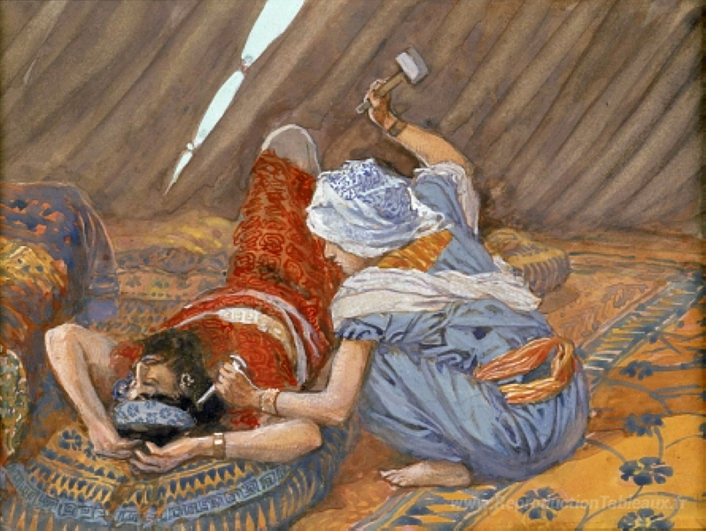 Nous vous proposons une reproduction artisanale sur toile du célèbre tableau 'Jael a frappé Sisera et l'a tué' de James Tissot, provenant du Musée de la Reproduction.
