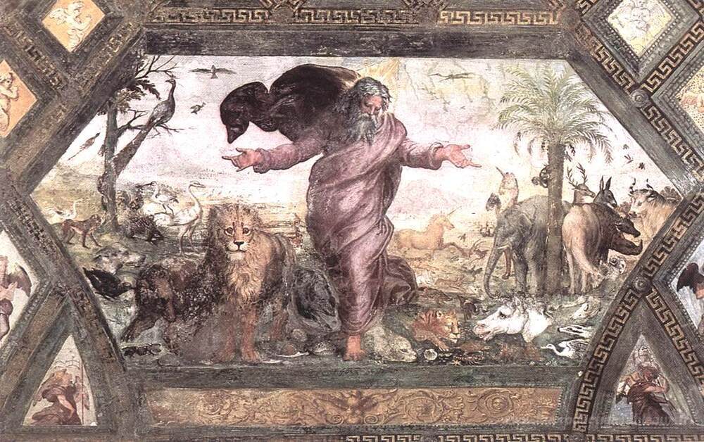 Nous vous proposons une reproduction artisanale sur toile du célèbre tableau 'La création des animaux' de Raphael, provenant du Musée de la Reproduction.