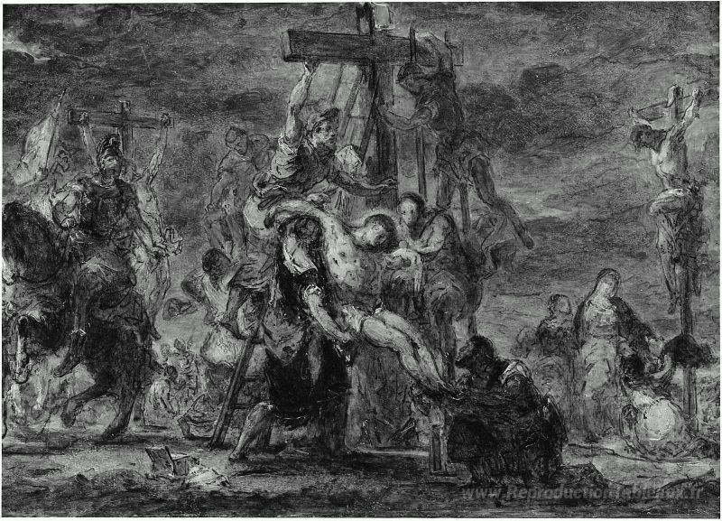 Nous vous proposons une reproduction artisanale sur toile du célèbre tableau 'La descente de la croix' de Eugene Delacroix, provenant du Musée de la Reproduction.