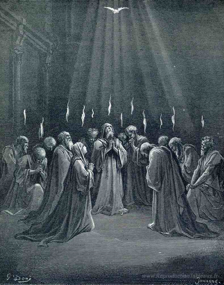 Nous vous proposons une reproduction artisanale sur toile du célèbre tableau 'La descente de l'esprit' de Gustave Dore, provenant du Musée de la Reproduction.