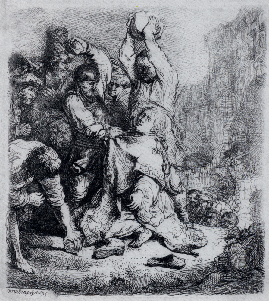 Nous vous proposons une reproduction artisanale sur toile du célèbre tableau 'La lapidation de St. Stephen' de Rembrandt, provenant du Musée de la Reproduction.