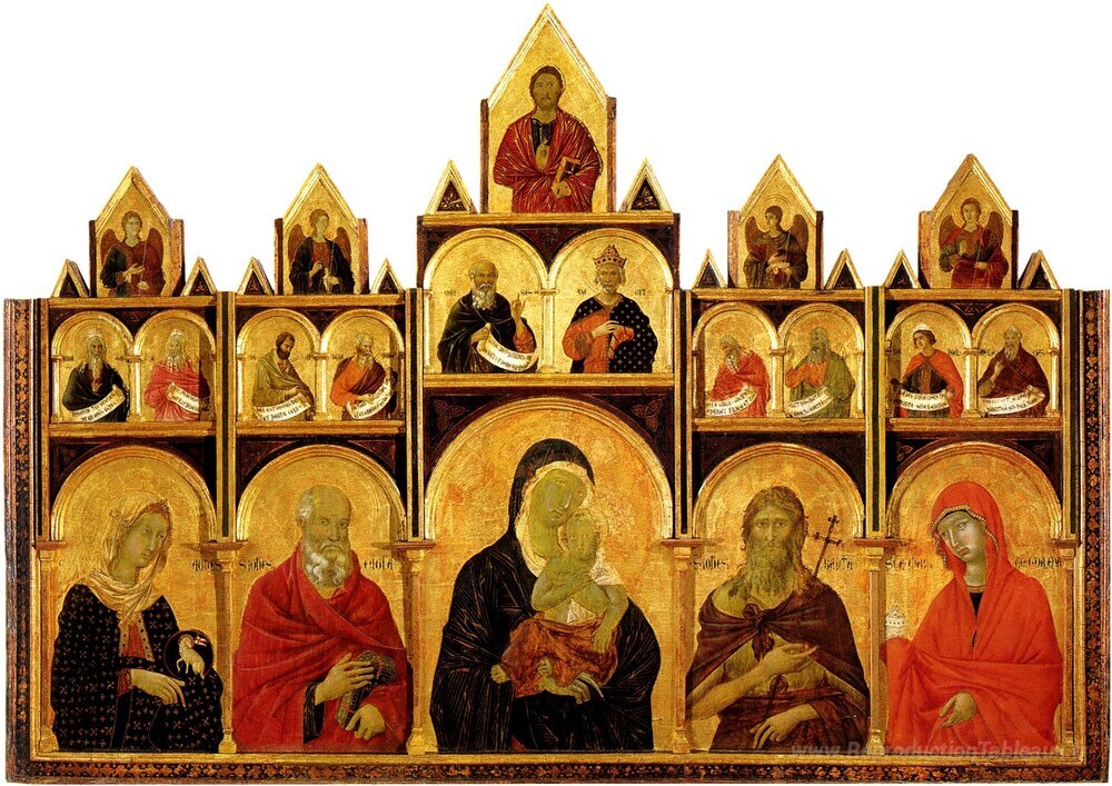Nous vous proposons une reproduction artisanale sur toile du célèbre tableau 'La madone et l'enfant avec des saints' de Duccio, provenant du Musée de la Reproduction.