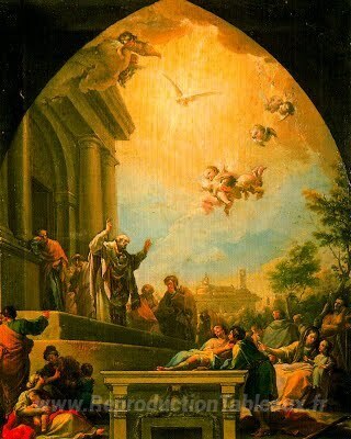 Nous vous proposons une reproduction artisanale sur toile du célèbre tableau 'La predicación de San Eugenio' de Francisco Bayeu y Subias, provenant du Musée de la Reproduction.