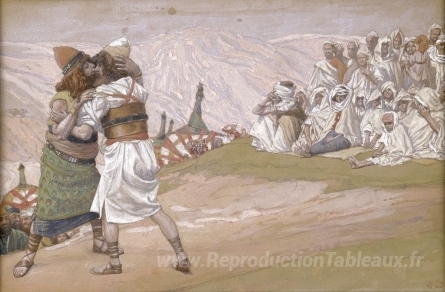 Nous vous proposons une reproduction artisanale sur toile du célèbre tableau 'La réunion d'Ésaü et de Jacob' de James Tissot, provenant du Musée de la Reproduction.