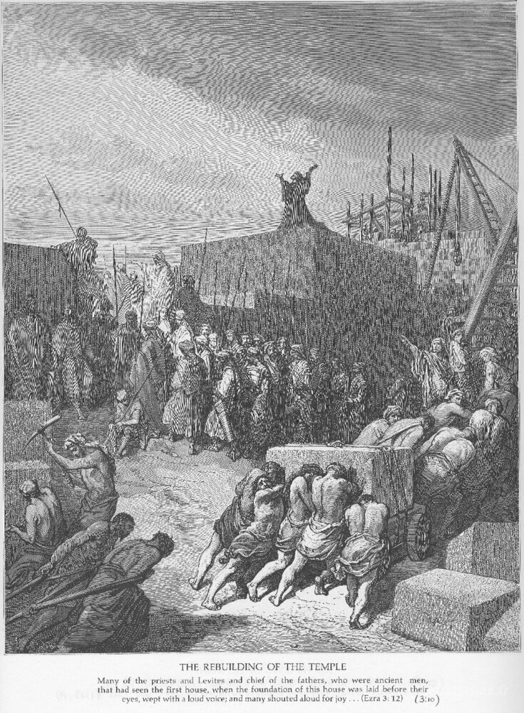 Nous vous proposons une reproduction artisanale sur toile du célèbre tableau 'La reconstruction du temple a commencé' de Gustave Dore, provenant du Musée de la Reproduction.