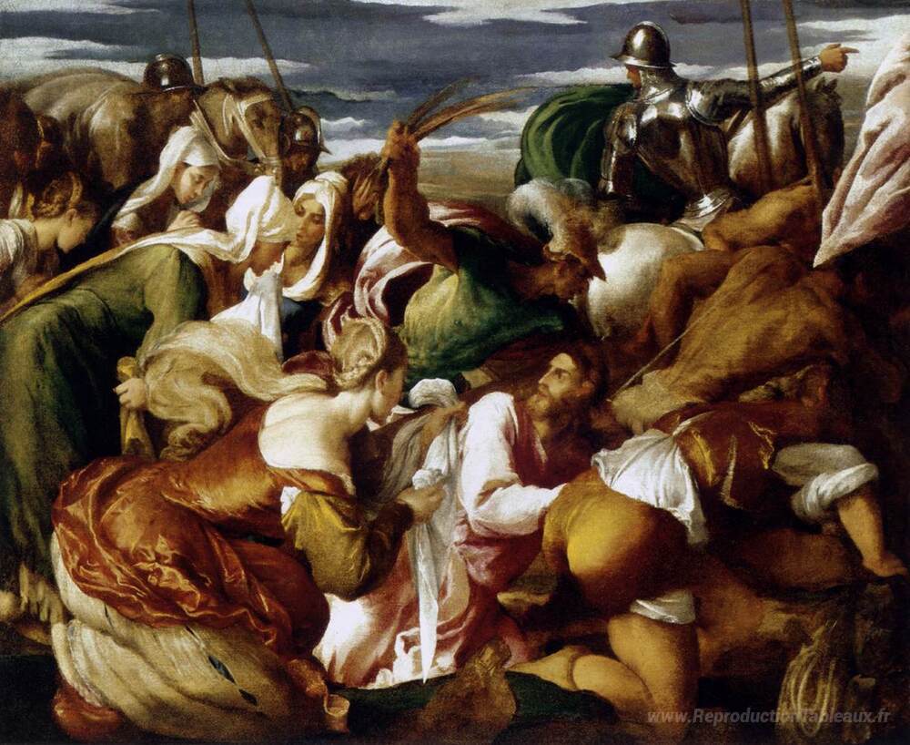 Nous vous proposons une reproduction artisanale sur toile du célèbre tableau 'La route du Calvaire' de Jacopo Bassano, provenant du Musée de la Reproduction.