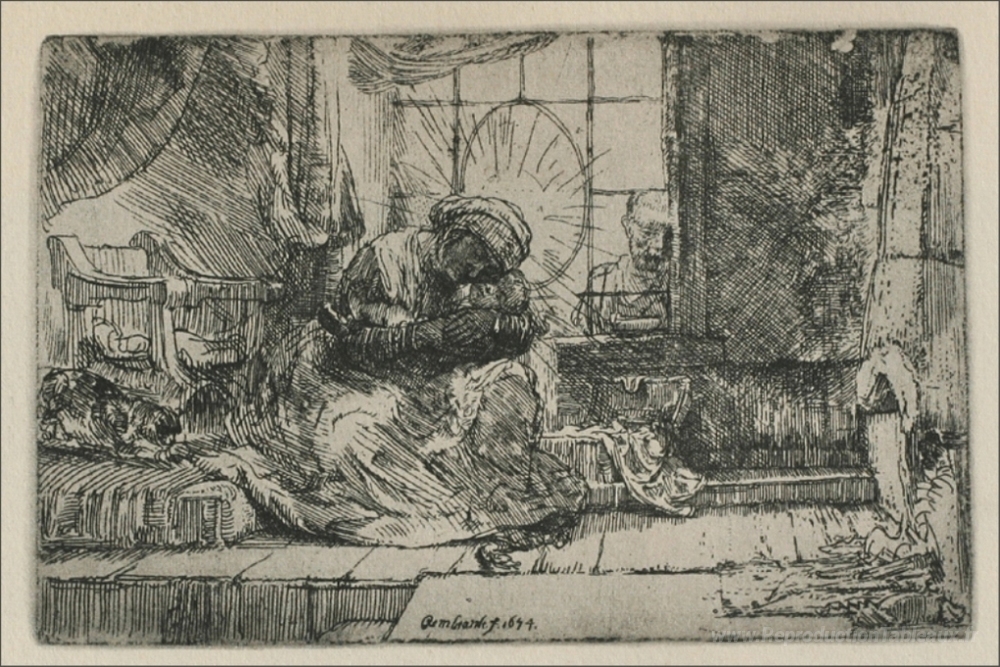 Nous vous proposons une reproduction artisanale sur toile du célèbre tableau 'La Sainte Famille avec un chat' de Rembrandt, provenant du Musée de la Reproduction.