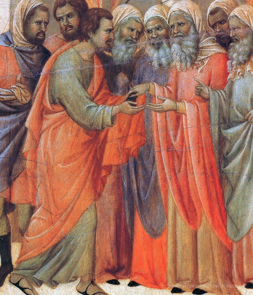 Nous vous proposons une reproduction artisanale sur toile du célèbre tableau 'La trahison de Judas (fragment)' de Duccio, provenant du Musée de la Reproduction.