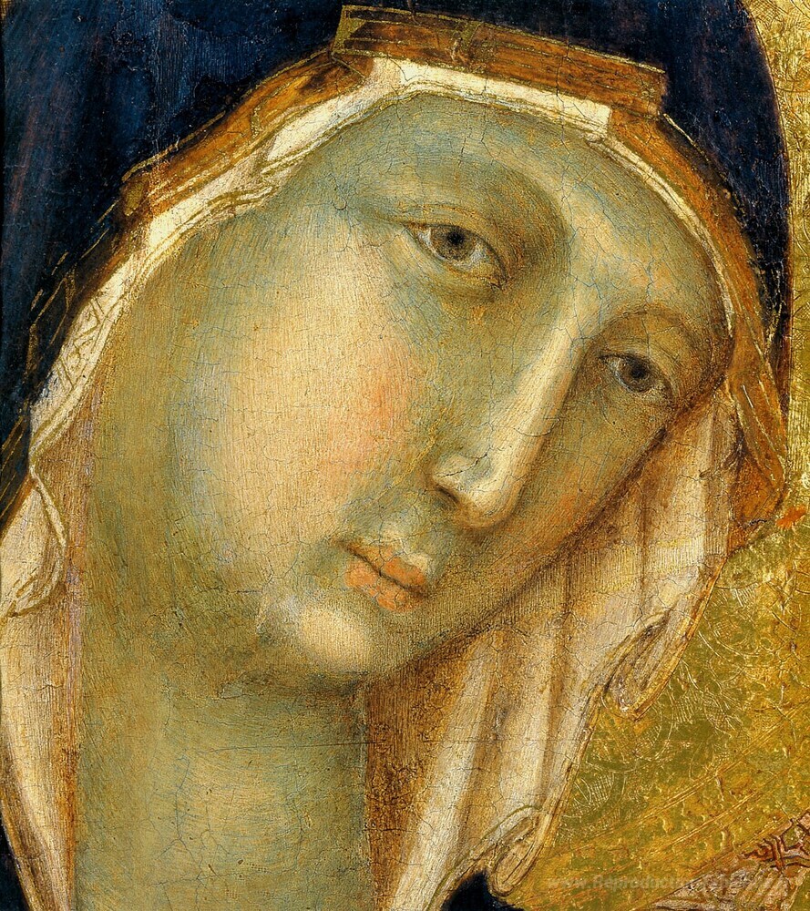 Nous vous proposons une reproduction artisanale sur toile du célèbre tableau 'La vierge et l'enfant sur un trône (fragment)' de Duccio, provenant du Musée de la Reproduction.